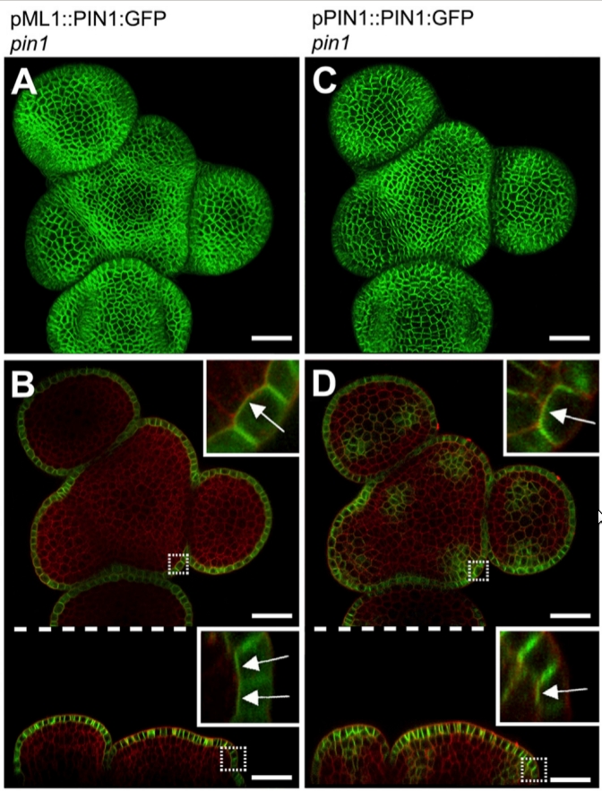 During my first post-doc in Bern with Cris Kuhlemeier I become interested in plant development. I focused my research on organ positioning at shoot apical meristem called phyllotaxis. Phyllotaxis is among the most conspicuous patterning processes in plants. Interestingly organ positioning is tightly linked to the patterning of vein formation. The expression and polarization of the auxin efflux carrier PIN1 is the earliest marker for both processes, with mathematical models indicating that PIN1 can respond to auxin gradients and/or auxin flux. I used cre/loxP-mediated PIN1 knock-outs as well as cell layer specific complementation of the Arabidopsis thaliana pin1 mutant to examine the interaction between phyllotactic patterning, which occurs primarily in the L1 surface layer of the meristem, and midvein specification in the inner tissues. I managed to show that PIN1 expression in the L1 is sufficient for correct organ positioning, as long as the L1-specific influx carriers are present. Thus, differentiation of inner tissues can proceed without PIN1 or any of the known polar transporters. Contrarily loss of PIN1 in the L1 can be partially compensated by upregulation of PIN1 in the sub-epidermal L2 layer, resulting in partial rescue with abnormal phyllotaxis and formation of sterile flowers. On theoretical grounds, this research suggested that canalization of auxin flux between an auxin source and an auxin sink may involve facilitated diffusion rather than polar transport.